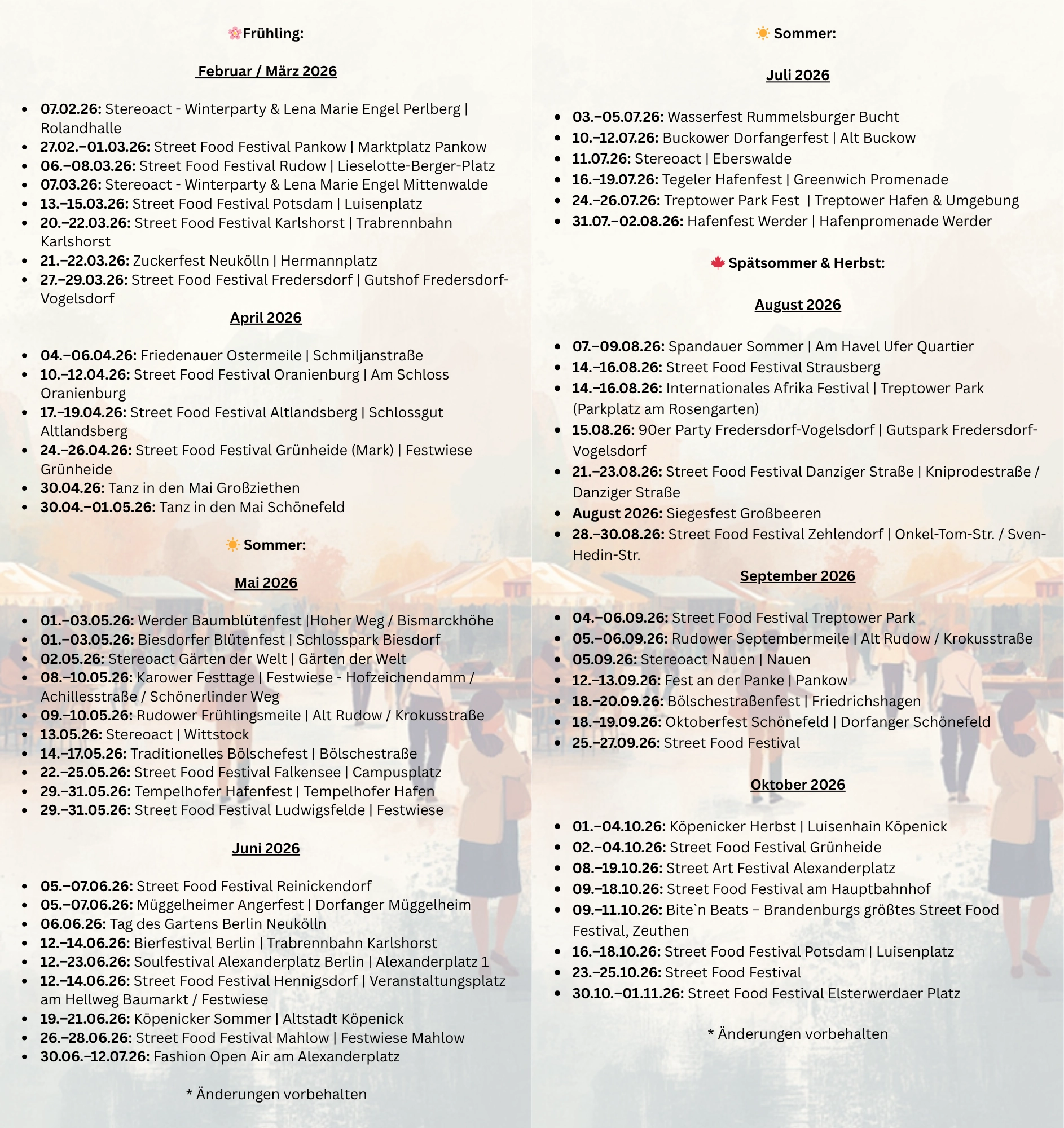 Freuen Sie sich auf kulinarische Entdeckungen von Street Food in Potsdam und Werder bis hin zu Spezialitäten in Pankow oder Neukölln. Genießen Sie Tradition beim Köpenicker Sommer, dem Bölschefest oder der Baumblüte. Dazu erwarten Sie kulturelle Highlights – von Street Art am Alexanderplatz bis zu idyllischen Hafenfesten an der Havel. Unsere Hauptstadt Kultur Sommerevents verbinden Genuss, Tradition und Kiezgefühl zu einzigartigen Erlebnissen, die den Sommer in der Region Berlin-Brandenburg perfekt abrunden.
